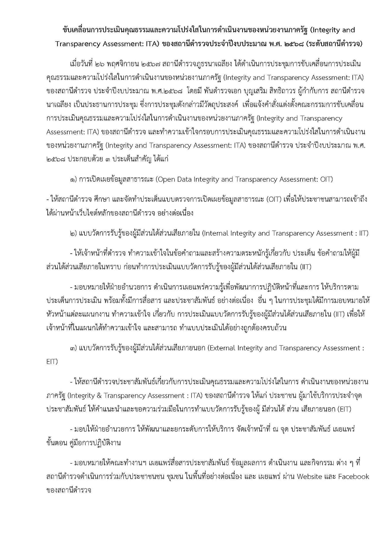 2. ขับเคลื่อนการประเมินคุณธรรมและความโปร่งใสในการดำเนินงานของหน่วยงานภาครัฐ (Integrity and Transparency Assessment: ITA) ของสถานีตำรวจประจำปีงบประมาณ พ.ศ. 2568 (ระดับสถานีตำรวจ) ครั้งที่ 1